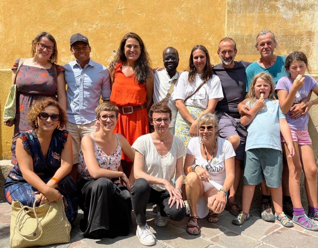 (1.28 MB)Des commanditaires, l'artiste, la médiatrice et des partenaires et allié·es à Tende en Juillet 2022, lors du Festival des Passeurs d'Humanité. Photo : thankyouforcoming.