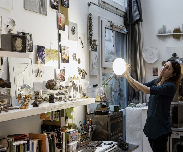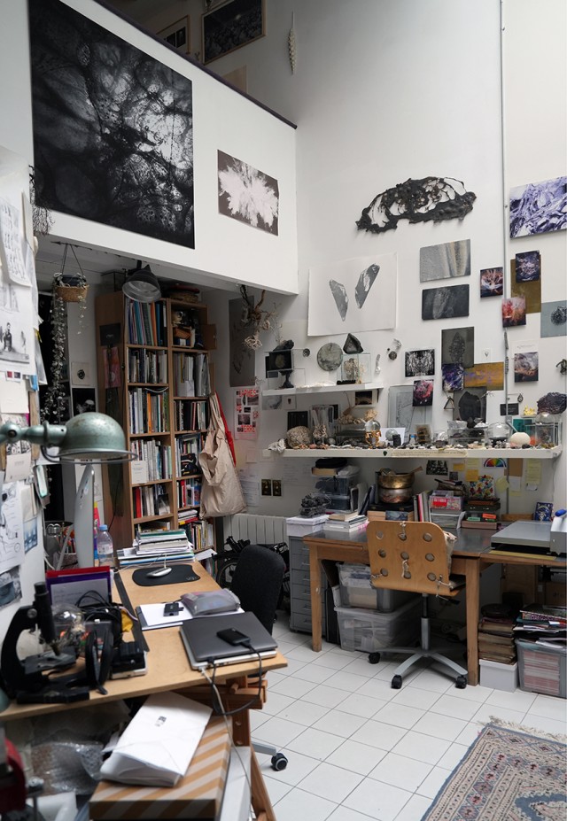 Après mon diplôme, j’ai eu la chance qu’on me propose de partager un atelier à Paris pendant plusieurs années, et j’ai pu avoir un espace pour laisser des choses en place et expérimenter. Nous étions deux, et c’était très différent de l’atelier collectif : on peut faire des pauses, demander l’avis de l’autre, échanger sur différents points. C’est également moins de solitude. C’est dans cet atelier que j’ai commencé par exemple à faire des cultures, comme celles de cristaux de sel par exemple, ce que je ne pouvais pas vraiment faire à l’école. J’ai aussi pu réaliser des œuvres qui demandaient beaucoup d’espace, car nous disposions d’un îlot central assez vaste. Ceci étant, l’espace n’a jamais été un frein pour développer des choses, parce que je travaille souvent en fonction des invitations que l’on me fait, et essentiellement par rapport à des lieux spécifiques. Ainsi, l’atelier se déplace dans le lieu lui-même.