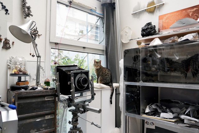 Mais le souvenir d’un espace aux murs immaculés avait rapidement disparu lorsque j’avais découvert l’atelier-logement de l’artiste, qui correspondait pour moi bien plus à l’image fantasmatique de l’antre ou de la grotte – certes parfaitement rangée, chaque objet, choisi avec soin, ayant l’air d’être à l’exacte place qu’il méritait.