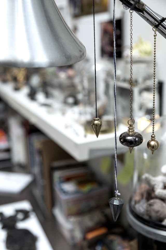 J’aime les objets, j’ai besoin d’en avoir autour de moi, dans mon logement comme à l’atelier ; j’en ai toujours beaucoup ramené, que je trouvais, que j’achetais, qui étaient une manière de se rappeler un voyage, une culture, une histoire, une rencontre… L’atelier est une extension de soi, une façon de voyager sans se déplacer, un espace de liberté. Comme l’armoire magique dont je parlais plus tôt, c’est une caverne, un lieu très personnel d’où sortent des éléments intimes de ton histoire. Mes objets sont une sorte de famille, ils sont tellement présents que parfois je ne les vois plus, et c’est le regard extérieur qui vient les animer. Je peux passer des journées à les contempler, à me remémorer ce que j’ai, en me disant que certains d’entre eux vont activer une case dans mon cerveau. L’atelier aussi est un cerveau.