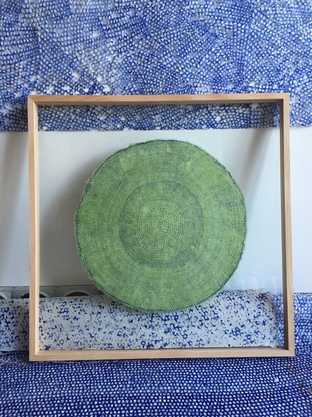 Dans mon logement-atelier, les œuvres sont dans tous les lieux, dans la chambre, l’entrée, mais surtout dans le salon où j’ai mon espace de travail. J’ai deux tables sur lesquelles je dessine, car je ne le fais jamais au mur, mais assis ou debout, au-dessus de mon support. Ma façon de travailler fait que certaines pièces apparaissent au verso, et je les découvre à la fin. J’aime ce travail en aveugle, le fait de ne pas avoir de vision d’ensemble au moment où je dessine, mais la révéler après.