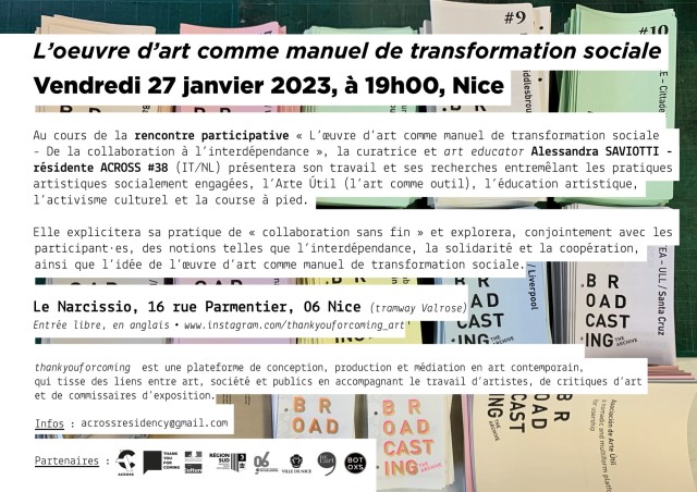 Lors de cette rencontre, Alessandra Saviotti présentera son travail et ses recherches entremêlant les pratiques artistiques socialement engagées, l'Arte Útil, l'éducation artistique, l'activisme culturel et la course à pied. En s’appuyant sur différentes collaborations qui se sont rapidement imposées comme interdépendance, elle explicitera sa pratique de "collaboration sans fin" avec de nombreuses et nombreux artistes, conservateurs et universitaires par-delà les fuseaux horaires. Paradoxalement, ses principales alliances de travail se sont développées dans une "amitié radicale" et ont duré plus d'une décennie.