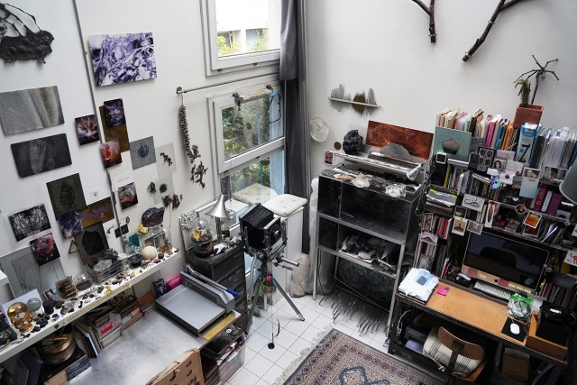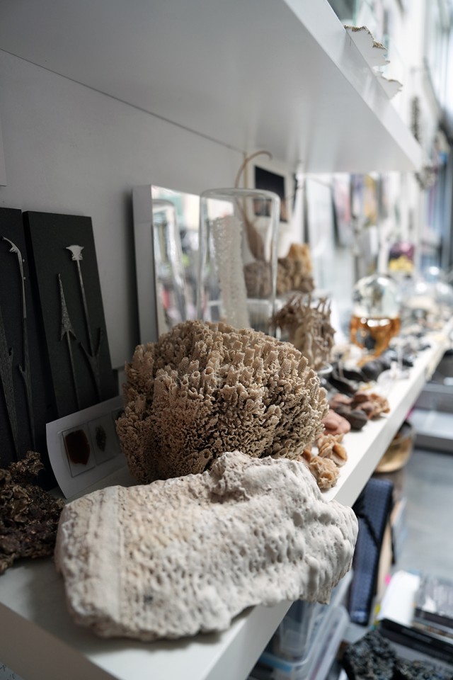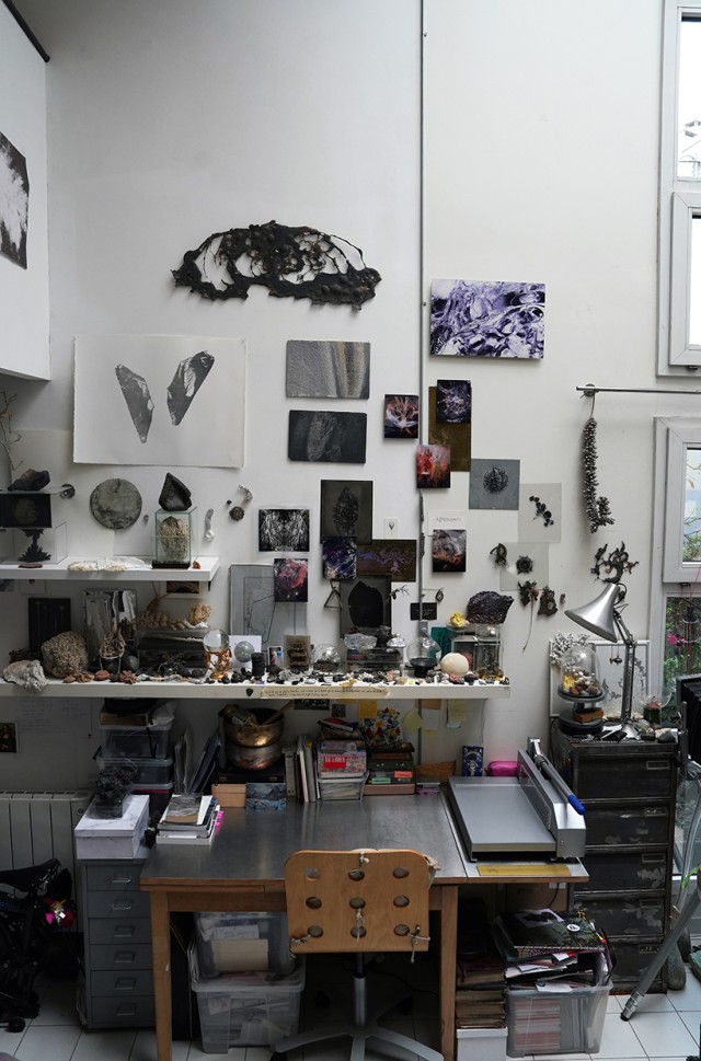 Après mon diplôme, j’ai eu la chance qu’on me propose de partager un atelier à Paris pendant plusieurs années, et j’ai pu avoir un espace pour laisser des choses en place et expérimenter. Nous étions deux, et c’était très différent de l’atelier collectif : on peut faire des pauses, demander l’avis de l’autre, échanger sur différents points. C’est également moins de solitude. C’est dans cet atelier que j’ai commencé par exemple à faire des cultures, comme celles de cristaux de sel par exemple, ce que je ne pouvais pas vraiment faire à l’école. J’ai aussi pu réaliser des œuvres qui demandaient beaucoup d’espace, car nous disposions d’un îlot central assez vaste. Ceci étant, l’espace n’a jamais été un frein pour développer des choses, parce que je travaille souvent en fonction des invitations que l’on me fait, et essentiellement par rapport à des lieux spécifiques. Ainsi, l’atelier se déplace dans le lieu lui-même.