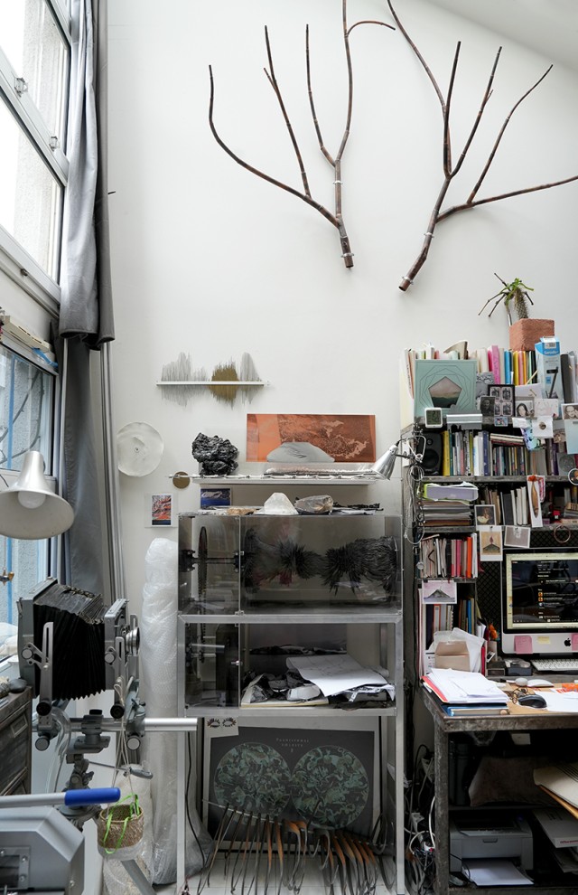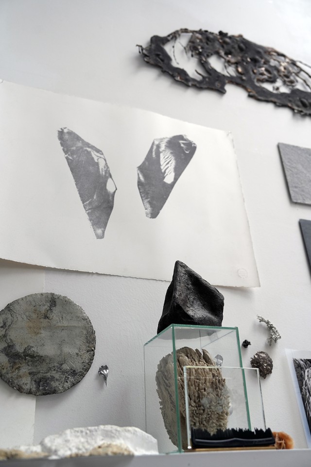 Lorsque je suis entrée aux Beaux-arts de Tours, j’ai beaucoup pratiqué la photographie. Pour moi, la photographie, c’était d’abord la chambre, là où tout est possible quand tu fermes le rideau et que tu t’isoles de la réalité. C’est là que se révèle l’image, c’est un accès à la connaissance, au savoir et à la technique. J’aimais les objets liés au développement, la capacité que l’on acquiert de maîtriser parfaitement tous les gestes à effectuer dans le noir complet. C’était l’endroit où lorsqu’on avait réussi à gérer la technique, tout pouvait advenir, un espace de liberté et d’expérimentation où le temps était suspendu, une sorte de grotte. Paradoxalement, je n’ai que peu de souvenirs des ateliers collectifs à l’école, j’étais assez nomade. Mais parallèlement à ces lieux où je ne laissais que peu de choses, j’accumulais beaucoup chez moi. Depuis l’enfance, la collecte occupe une place importante dans mon imaginaire. Dans mon appartement tourangeau, je possédais un caméléon séché, une pieuvre dans du formol, des animaux morts, des crânes, des cailloux, le tout ramené de voyages ou issu de trouvailles lors de marches. J’avais une vraie fascination pour l’observation de matières organiques figées ou en évolution.