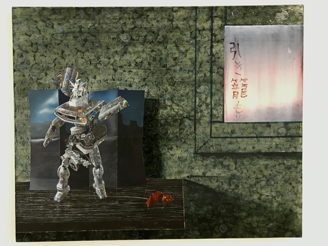 Néanmoins, au bord du délabrement, ce corps usé par l’urgence productive en appelle au repos, au retrait du monde. En regard, Johan Christ-Bertrand puise dans les univers de l’animé, du jeu vidéo et de la fantasy, mêlés à des symboles traditionnels, les multiples références qui composent ses toiles à l’ambiance digitale. Il dépeint une épreuve personnelle du jeu, dont l’interprétation ne se fait plus du point de vue du game mais du côté du play, à partir de l’expérience intérieure du joueur. L’œuvre au titre évocateur, Hikiko / Memento Mori, (2019) suggère l’intimité calfeutrée d’une chambre où apparaît sur une fenêtre embuée, le mot calligraphié « hikikomori », désignant un état psychosocial où l’on vit cloîtré, mis au ban de la société. Sur une table en bois vieillie par les années, sont disposés un Transformer , un jeu de dés et la carte d’un paysage en nuit américaine. De cet isolement premier se crée un nouvel univers, de jeu et de fiction, de rôle et de hasard, dont le scénario est déjà écrit, sous-tendant la tragédie d’une prédétermination logicielle.