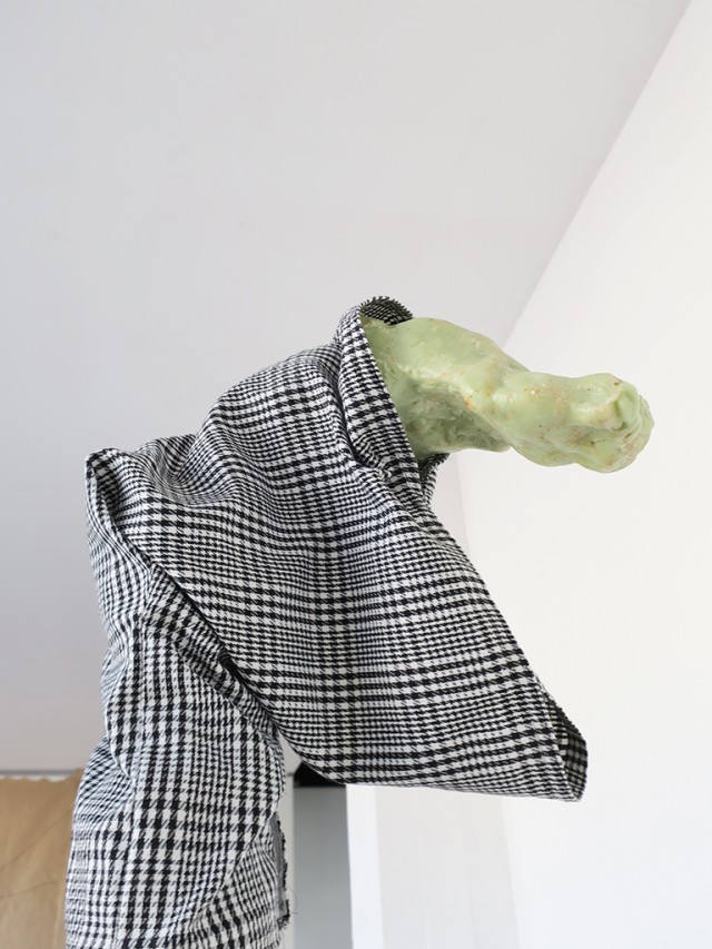 Vue d’exposition, tissu, cire, métal, toile cirée