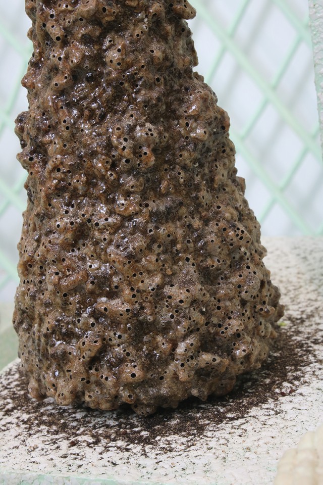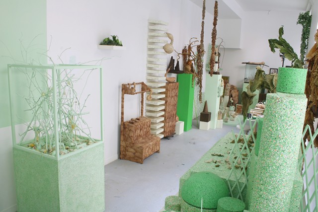 De l’extérieur, on dirait un aquarium, qui longe une étroite cour dans le quartier de Belleville, à Paris. Il n’est pas très large, mais il semble être fait pour être arpenté : ici, une table, là encore une autre table, une place pour chaque chose, pour les centaines d’objets qui s’amoncellent là dans une organisation savamment accumulative : certains sont destinés à être transformés en œuvres, comme les feuilles de légumes trempées dans la glycérine, dont les teintes ternes contrastent avec leur souplesse, ou encore les excréments de vers à soie. Agglomérés par un liant acrylique, ils paraissent précieux comme des minéraux rares.
