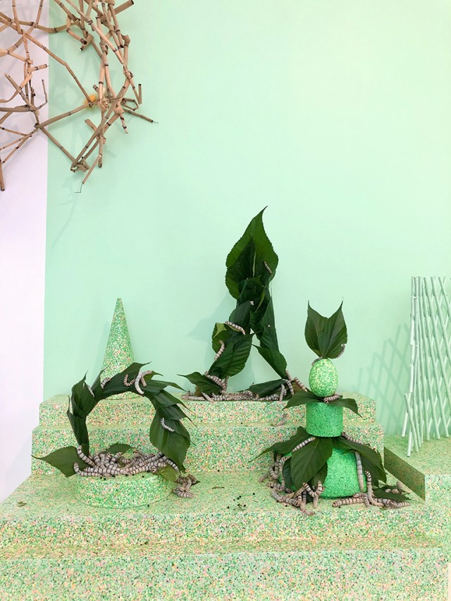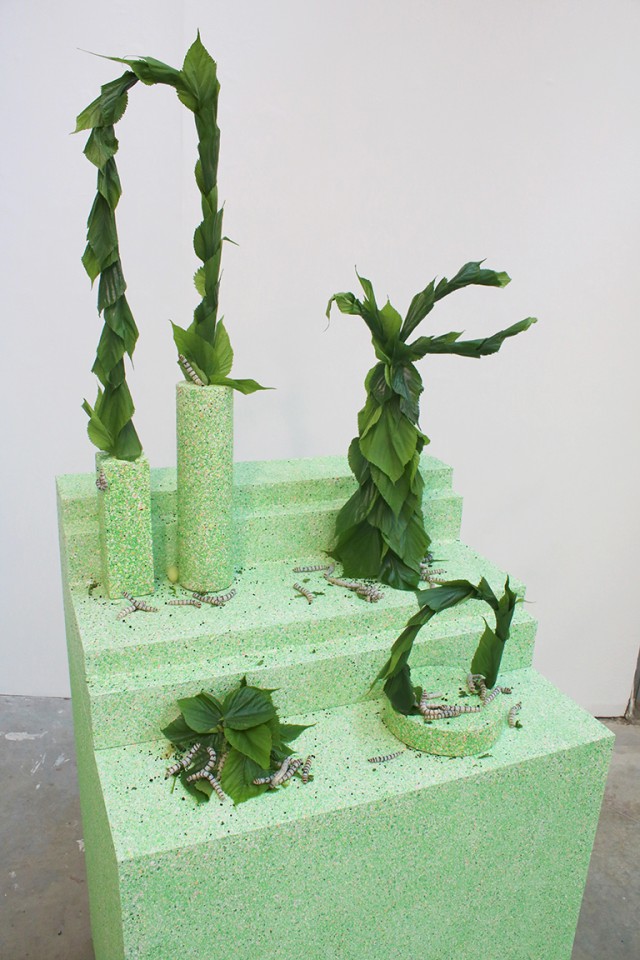 Je dis que j’ai une pratique saisonnière. Au printemps, l’atelier est occupé par les vers à soie : ils éclosent chez moi, je les amène ici chaque matin et je les ramène dans mon appartement chaque soir. Qu’il y ait ou pas exposition, je continue à les élever, comme un engrenage que je ne peux pas arrêter. La dimension performative d’un tel projet n’est pas affichée, mais plutôt cachée. À l’automne, je développe beaucoup mes recherches autour des courges, des choux, du céleri, des endives, du fenouil… Je les trempe dans la glycérine pour les stabiliser, ce qui leur donne cet aspect décrépi, mais souple. À la fin de la saison et au début de l’hiver, je travaille surtout sur le tri des excréments des vers à soie, pour réaliser mes sculptures. La temporalité est très importante dans mon œuvre : il y a à la fois du vivant en train de s’épanouir, mais aussi des reliques du vivant qui a été là. Mon atelier est assez encombré, car j’aime avoir tout ce qui m’intéresse à portée de vue, donner à chaque chose une présence. Je crois beaucoup à la coexistence du naturel et de l’artificiel, avec des frontières volontairement perméables, ambiguës."