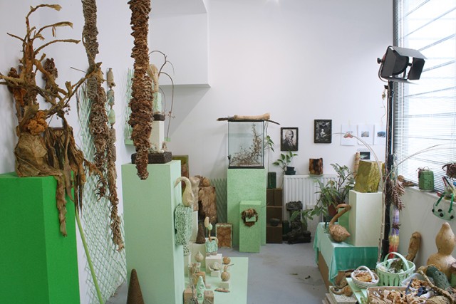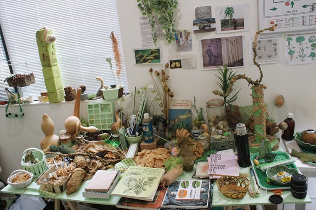 Mais d’autres objets sont plutôt là pour les phases de recherche, peut-être pour permettre au regard d’être toujours agile : dessins d’enfants, ouvrages sur les volcans ou les vers à soie, coupures de journaux, planches de sciences naturelles et merveilles de la nature (calebasses, graines séchées…). Je remarque quelques détails qui me plaisent tout particulièrement – joie grégaire de trouver une amatrice complice : une carte postale d’une Merda d’artista de Manzoni, une autre du Karnickelköttelkarnickel de Dieter Roth. Il n’y a rien de décoratif dans l’atelier, tout est réuni, à portée de main. Et puis il y a surtout cette ambiance générale, un lieu hanté par un vert amande étrange, bien éloigné du beige des légumes glycérinés ou du vert pétant des feuilles de mûrier avec lesquelles l’artiste nourrit ses vers à soie. Le vert contamine tout, depuis l’essuie-main de la salle d’eau jusqu’au fauteuil en rotin en passant par l’emballage de la tablette de chocolat que l’artiste a sortie pour me recevoir (elle jure qu’elle n’a pas fait exprès).