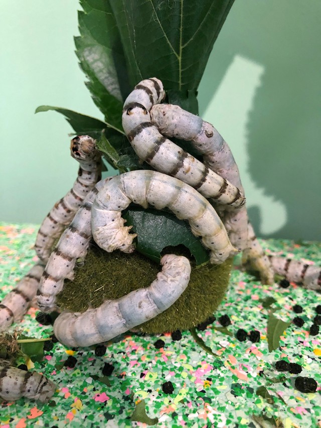 La première fois que je suis venue visiter son atelier, Ivana Adaime Makac m’a proposé de revenir quelques mois plus tard : les vers à soie seraient mûrs. L’atelier était métamorphosé, bruissant des mâchouillements des insectes, révélant sa saisonnalité. Les locataires étaient affamés, je regardais Ivana Adaime Makac les nourrir en me parlant, et j’ai aimé cette ambiance de pouponnière, ce travail qui ne s’arrête véritablement jamais, cette capacité à penser les lieux autrement.