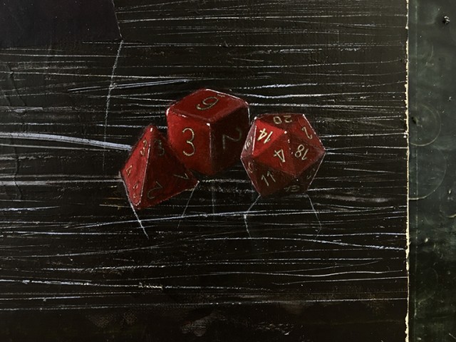 Néanmoins, au bord du délabrement, ce corps usé par l’urgence productive en appelle au repos, au retrait du monde. En regard, Johan Christ-Bertrand puise dans les univers de l’animé, du jeu vidéo et de la fantasy, mêlés à des symboles traditionnels, les multiples références qui composent ses toiles à l’ambiance digitale. Il dépeint une épreuve personnelle du jeu, dont l’interprétation ne se fait plus du point de vue du game mais du côté du play, à partir de l’expérience intérieure du joueur. L’œuvre au titre évocateur, Hikiko / Memento Mori, (2019) suggère l’intimité calfeutrée d’une chambre où apparaît sur une fenêtre embuée, le mot calligraphié « hikikomori », désignant un état psychosocial où l’on vit cloîtré, mis au ban de la société. Sur une table en bois vieillie par les années, sont disposés un Transformer , un jeu de dés et la carte d’un paysage en nuit américaine. De cet isolement premier se crée un nouvel univers, de jeu et de fiction, de rôle et de hasard, dont le scénario est déjà écrit, sous-tendant la tragédie d’une prédétermination logicielle.