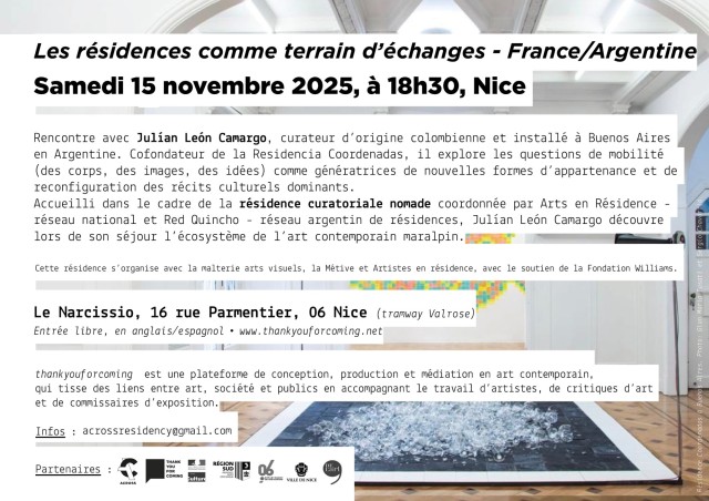 Le samedi 15 novembre 2025 à 18h30, thankyouforcoming vous invite au Narcissio à venir rencontrer Julían León Camargo, artiste et curateur Colombien résidant en Argentine. Reçu dans le cadre de la résidence curatoriale nomade coordonnée par Arts en Résidence - réseau national et Red Quincho - réseau argentin des résidences, Julían León Camargo explore les questions de mobilité (des corps, des images, des idées) comme génératrices de nouvelles formes d'appartenance et de reconfiguration des récits culturels dominants. Lors de ce temps d’échange public qui se tiendra en anglais et/ou en espagnol, il présentera son