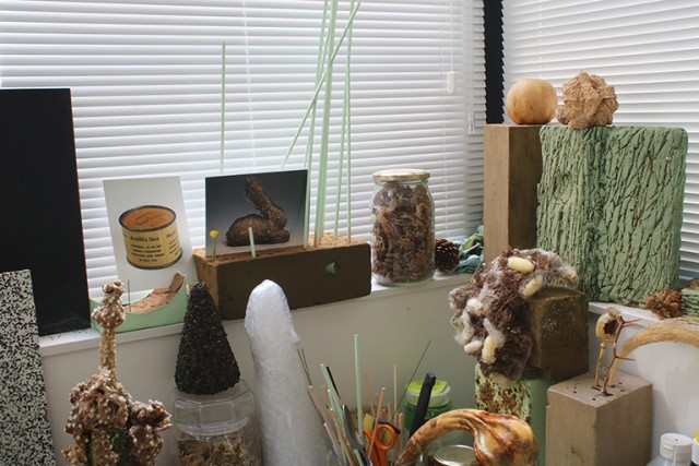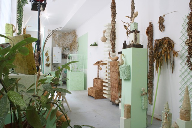 De l’extérieur, on dirait un aquarium, qui longe une étroite cour dans le quartier de Belleville, à Paris. Il n’est pas très large, mais il semble être fait pour être arpenté : ici, une table, là encore une autre table, une place pour chaque chose, pour les centaines d’objets qui s’amoncellent là dans une organisation savamment accumulative : certains sont destinés à être transformés en œuvres, comme les feuilles de légumes trempées dans la glycérine, dont les teintes ternes contrastent avec leur souplesse, ou encore les excréments de vers à soie. Agglomérés par un liant acrylique, ils paraissent précieux comme des minéraux rares.