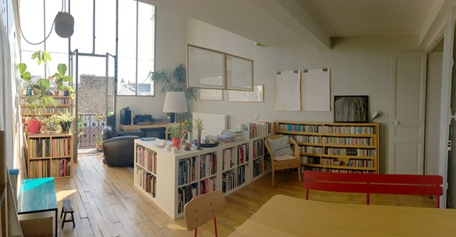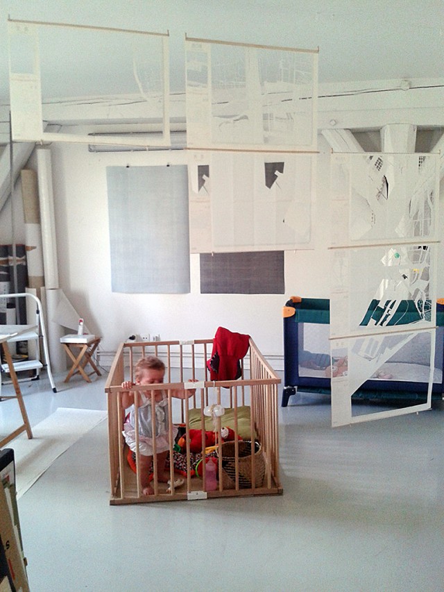 Quand ma fille est née en 2012, je l’emmenais beaucoup à l’atelier, car la première année, je n’avais pas de mode de garde ; elle avait un parc là-bas, elle passait souvent la journée avec moi. J’avais déjà déposé une demande d’atelier-logement, que l’on a eu en 2015. Pour moi, c’était une forme de pragmatisme, car à Paris financer un atelier en plus d’un logement est très coûteux. L’atelier-logement dans lequel nous avons emménagé se situait rue Hégésippe Moreau, dans le 18e arrondissement. J’avais la chance de pouvoir échanger régulièrement avec Estèla Alliaud, qui est devenue une amie et qui habitait juste en-dessous. On déjeunait souvent dans la cour, en parlant d’expositions à voir, en s’échangeant des conseils pratiques ou en évoquant d’autres artistes. Mais pour une famille, l’atelier-logement n’était pas forcément idéal : mon atelier était dans le salon, ce qui signifiait qu’il était impossible d’organiser des visites le week-end, en fin d’après-midi, le soir… Même si cela ne me dérangeait pas que mon espace de travail soit dans le lieu de la vie domestique, je ne pouvais plus travailler à de grands formats ou laisser traîner le travail en cours.