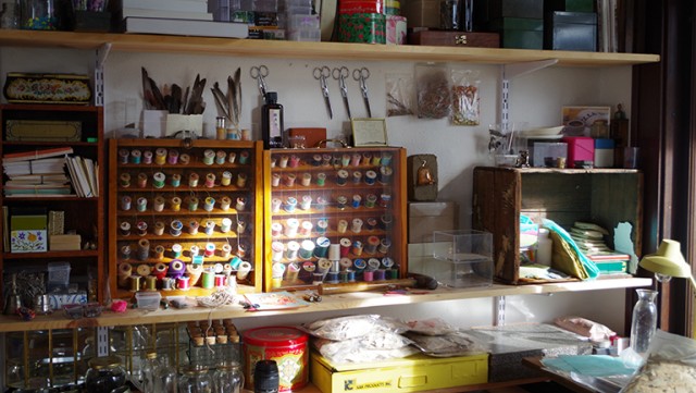 J’ai donc monté une table, de façon à travailler le dos collé au mur, face à la fenêtre, et j’ai d’abord posé dessus une boîte en bois avec mes outils de travail : des stylos, des crayons à papier, des perles colorées, du fil… J’ai également ramené mon énorme malle en métal, qui d’abord contenait essentiellement des grandes bobines de fil et du papier kraft.