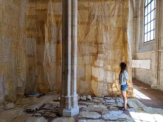 (404.71 KB)Natalia Villanueva Linares, DESMEDIDA, 2018, Collège de Bernardins. Patrons de vêtements usés + 7000 épingles , 15 m x 6 m. (c) l'artiste.