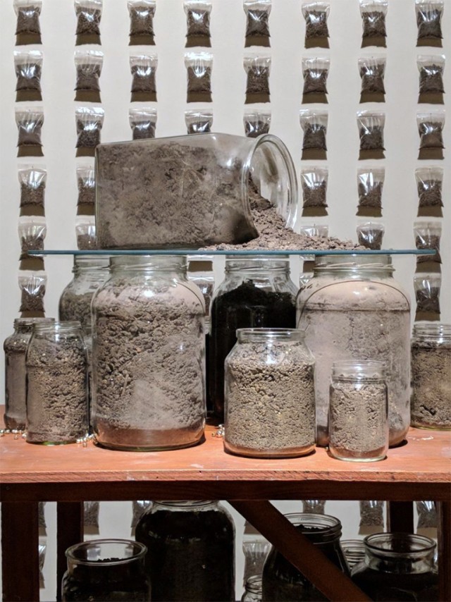 (520.36 KB)Natalia Villanueva Linares, MINA, 2012 – 2018, Peoria Riverfront Museum. 2,5 m x 9 m, une table et 20 pots de verre remplis de terre et petites cloches + 480 sacs de terre. (c) l'artiste.