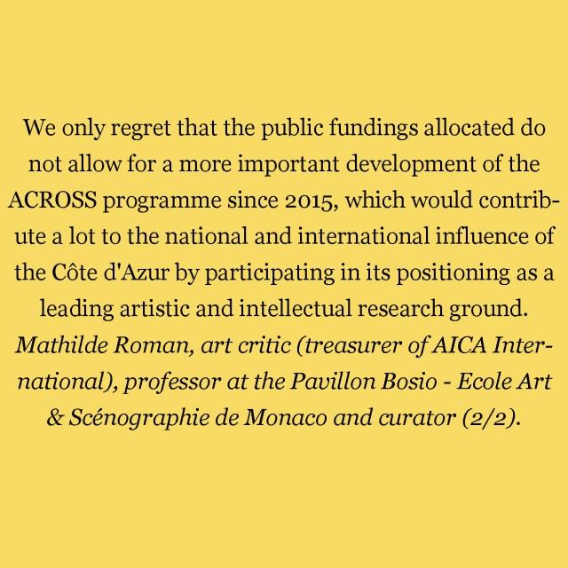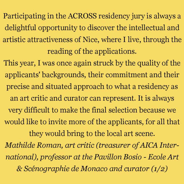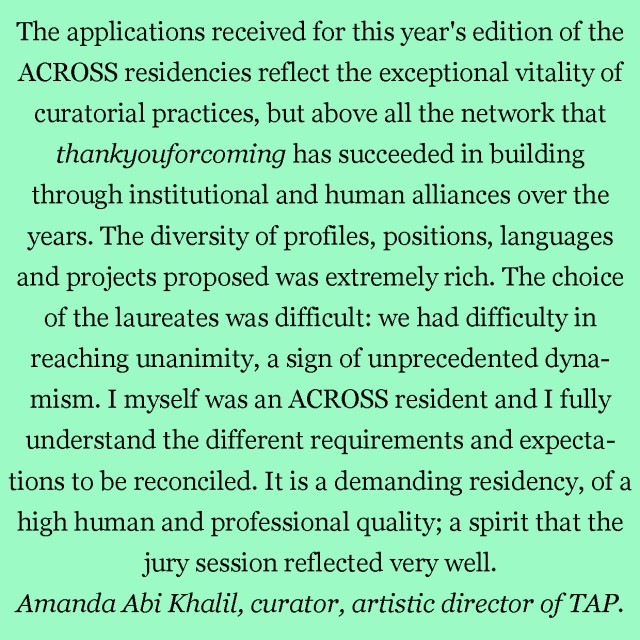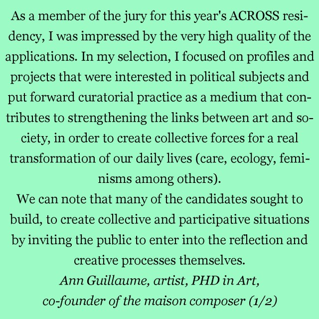 The selection process of the laureate of this 8th season of ACROSS residencies has demonstrated - once again in the 8 years of the programme's existence - the dynamism, quality and commitment of the critical and curatorial scenes around the world.