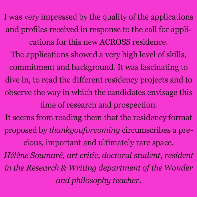 I Claire Migraine is an exhibition curator and production manager. She is artistic director of thankyouforcoming, coordinator of the ACROSS residencies and mediator of the "New Patrons" protocol.