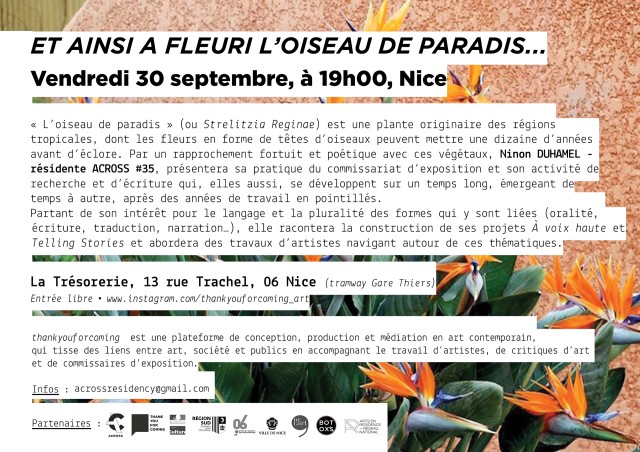 (1.36 MB)"Et ainsi a fleur l'oiseau de paradis...", conférence de Ninon Duhamel à la Trésorerie, Nice. Septembre 2022, photo thankyouforcoming.